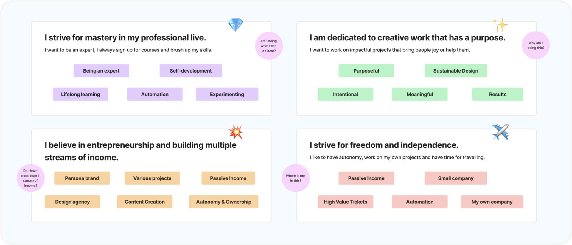 Example: "I want to be a design lead at a B2B SaaS company focused on healthcare because I value mentorship opportunities, want to make meaningful impact in people's health, need predictable hours for my family, and am energized by solving complex problems with long-term thinking"