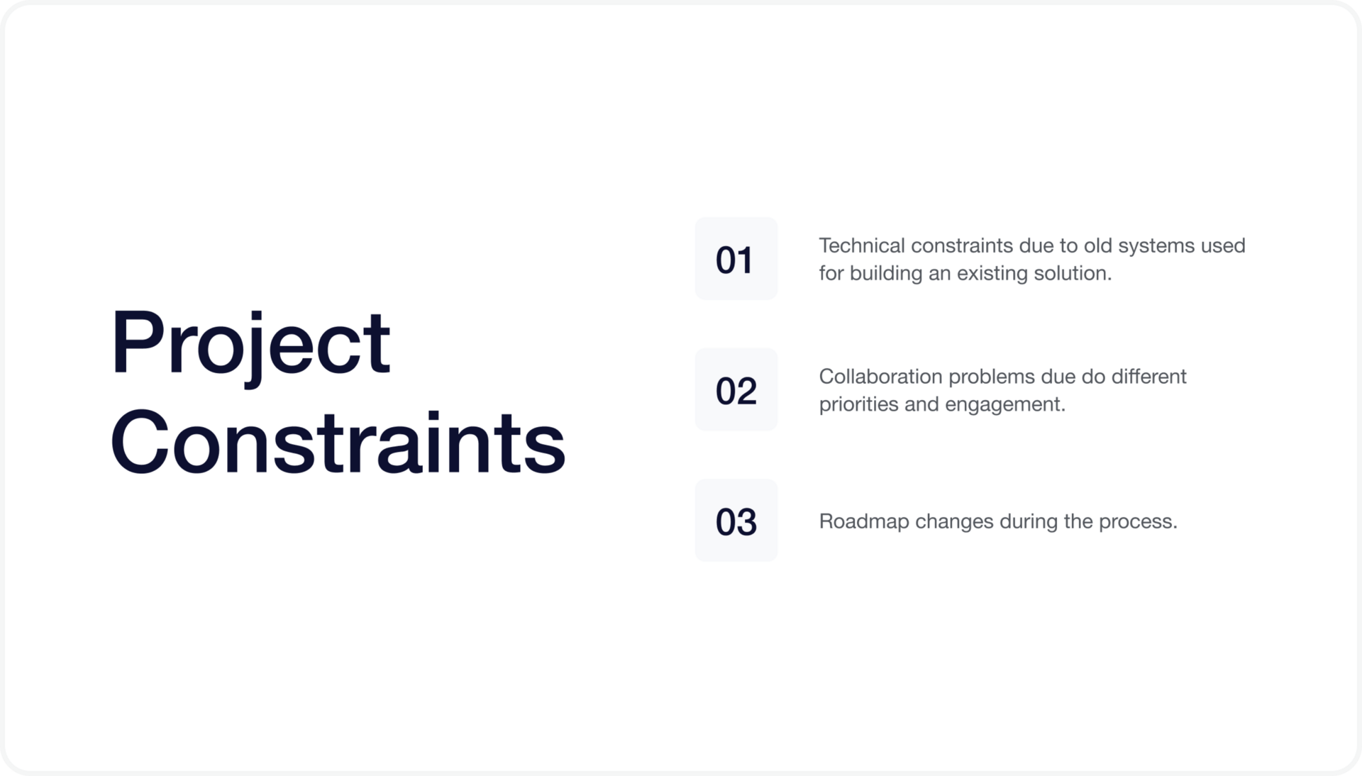 Every project has limits: time, technology, people, process, changes etc. Highlight the ones that actually influenced your design decisions or showcase skills relevant to the role you’re applying for.