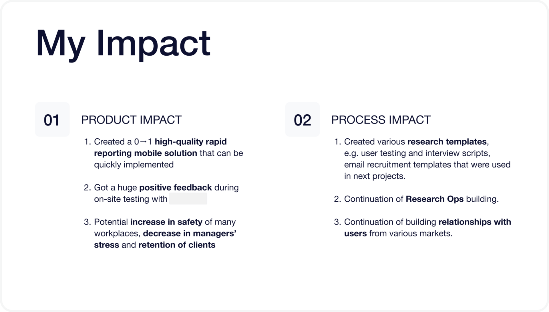 Clear role descriptions in project snapshots that explain the type of product (e.g. 0→1) and her impact (e.g. improved user satisfaction score, supported 80+ client accounts)